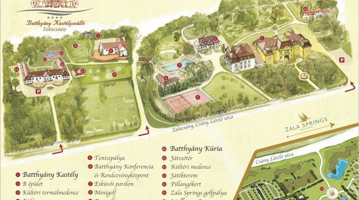 A Batthyány Kúria & Golf Resort**** csendes, nyugodt, 10 hektáros parkosított környezetben, egy apró település, Zalacsány szélén fekszik, mely 2014. április 1.-jén nyitotta meg kapuit. A Batthyány-kastéllyal ligetes parksétánnyal összekötött épület exkluzív szobái, étterme és lobbija új, modern, ugyanakkor hangulatos külsővel várja a pihenni vágyó vendégeket. A szobák korszerűsítése mellett a hotel lobbija, közösségi terei és parkja is átalakult.